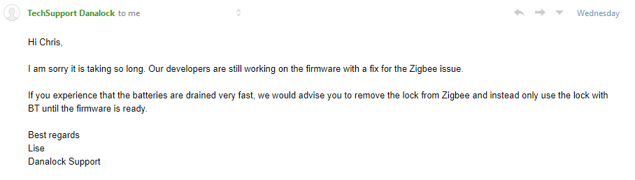 Iām guessing not, but has anyone heard anything from Danalock in terms of an ETA for a firmware update to fix this issue? They donāt respond to my support requests - I canāt believe the lack of communication and urgency on their part to get this fixed!
