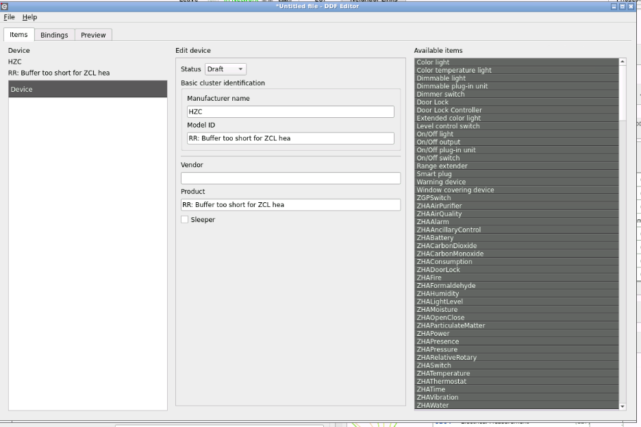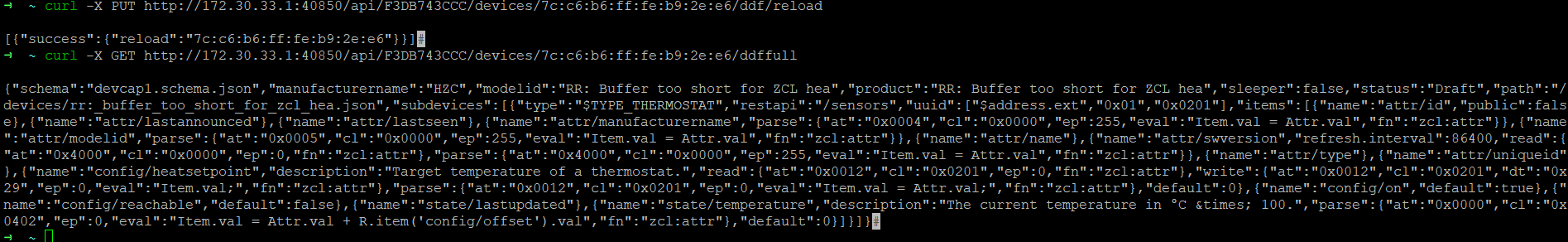 After it changed I went to DDF-editor to change it back. I enter the old name and number and press save with status GOLD. A file called thermostat.json is saved on the raspberry. No error message. I do a hot restart, no error message but it says it restarts a device HZC / RR: Buffer to short… In the log files it seems that all DDF-files on the system are parsed since it lists hundreds of products I don’t have.