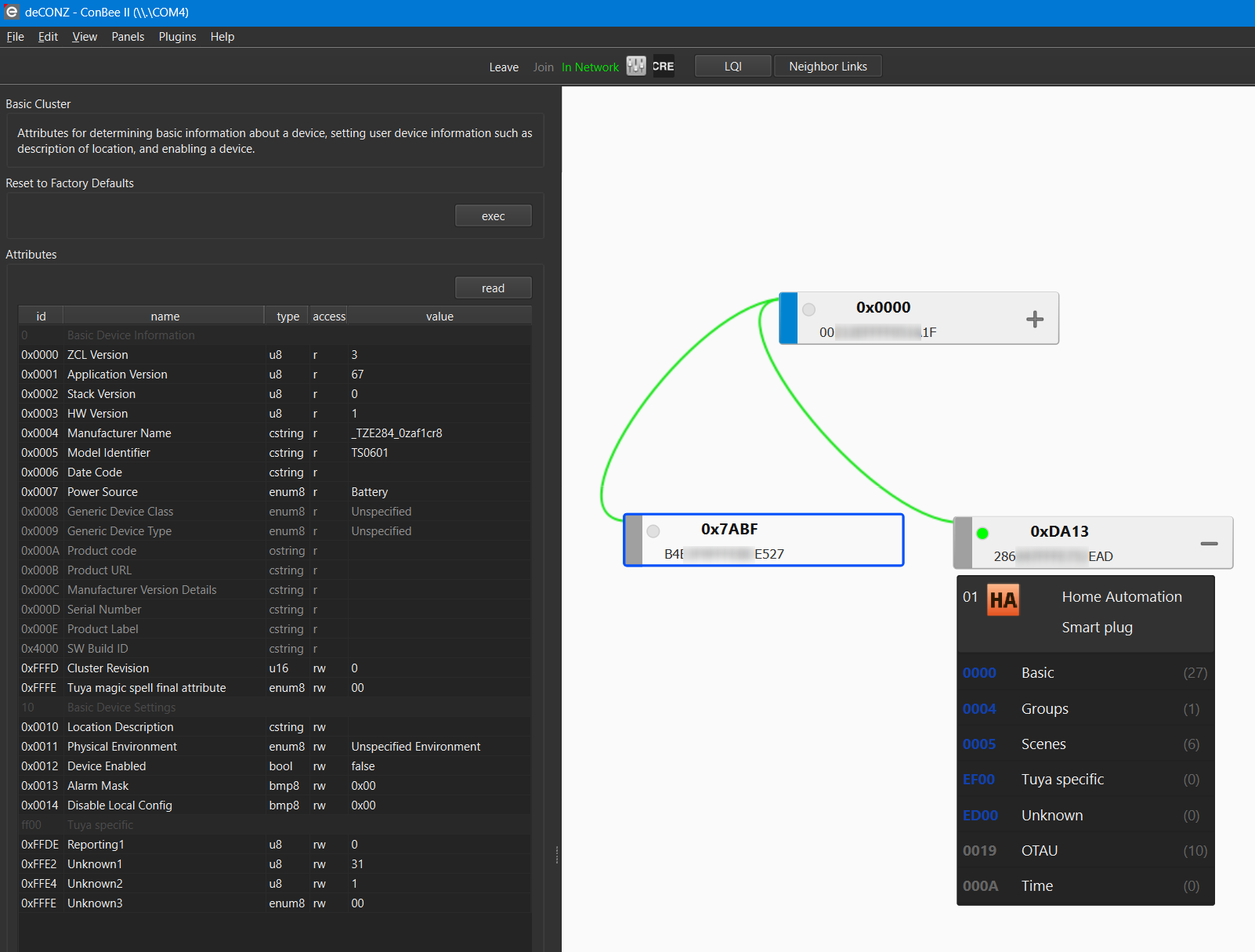 On node 0xDA13, I read the attributes via “Attributes > read.” Then the node LED in the Deconz GUI flashes blue. If I remove the battery from the smoke detector and execute “Read” again, the LED in node 0xDA13 flashes red. I interpret this as the “unreachable” status. If I reinsert the battery, the LED flashes blue again for “read.” Therefore, I assume it’s the smoke detector.