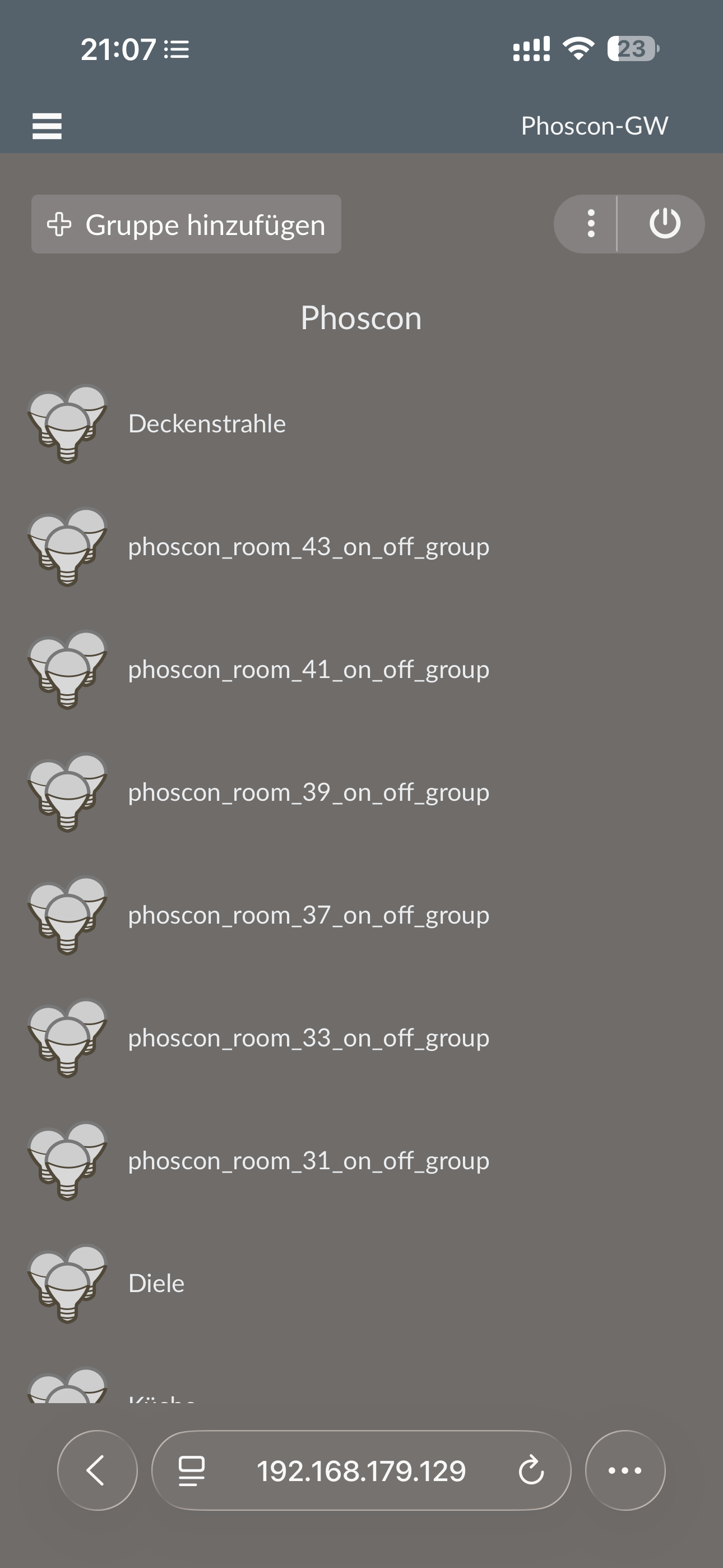 Ich habe hartnäckige Probleme mit dem Phoscon-GW auf dem Raspi in Docker. Wie Ihr sehen könnt habe ich komische Gruppen die ich nie angelegt habe. Wenn ich versuche eine Gruppe wie „Deckenstrahler“ anzulegen, kommt die Meldung, dass diese bereits existiert. Sie hat auch mal existiert, ist aber so nicht mehr zu sehen. Sie verbirgt sich anscheinend hinter einem der kryptischen Namen. Ich kann sie auch finden, aber nicht bedienen oder umbenennen. Gibt es eine Möglichkeit das wieder in den Griff zu bekommen ohne alles neu aufzusetzen und anzulernen. Das habe ich bei einem Licht auch schon getestet, das funktioniert aber auch nicht richtig. Wo kann ich Hilfe bekommen?
